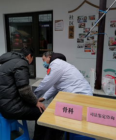 在义诊咨询桌前,名誉队长、主任中医师钟建平为居民提供了中医、中西医结合的诊疗服务,骨科学教授、主任医师葛志强为居民提供了骨科诊疗、司法鉴定咨询服务,副主任中医师、副教授石富娟为居民提供了中医诊疗、养生保健咨询服务,妇产科学高讲、主治医师周颖为居民提供了妇科诊疗、妇女保健咨询服务,全科医疗主治医师蒋月琴为居民提供了全科内科诊疗咨询服务。他们给予了热情接待,认真细致问诊,察看有关体征,现场指导在家康复方法,科学解答用药等咨询,提供个性化的防治意见。主管护师马建伟规范地为居民测量血压,并告知预防与维护方法。队长王建华在做好组织协调工作的同时认真接待前来咨询的居民。