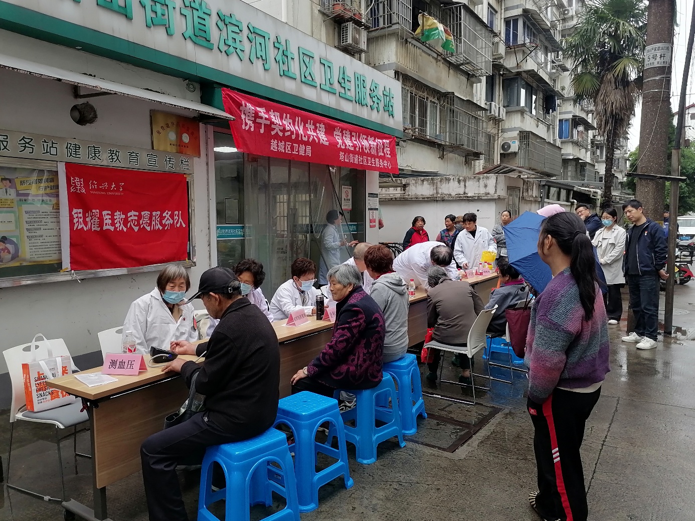 绍兴大学银耀医教志愿服务队首次组织8位老党员志愿者开展健康义诊咨询活动,在一个半小时服务中,为滨河社区80多人次的居民提供了义诊咨询等健康服务。